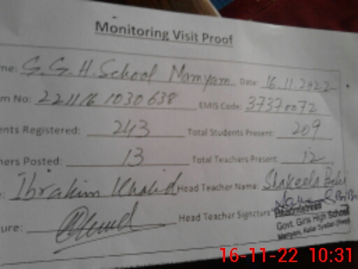 | Attendance Register | Head Teacher | MEA with School | Visit Proof |
