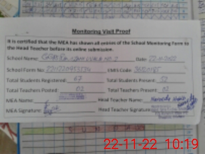 | Attendance Register | Head Teacher | MEA with School | Visit Proof |