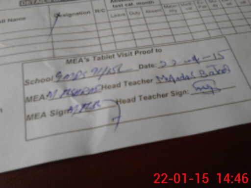 | Attendance Register | Head Teacher | MEA with School | Visit Proof |