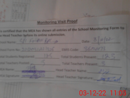 | Attendance Register | Head Teacher | MEA with School | Visit Proof |