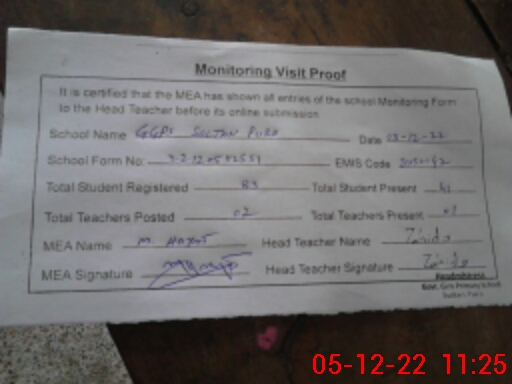 | EMIS Code: 31150042 | Name of School: GGPS SULTAN PURA | |||