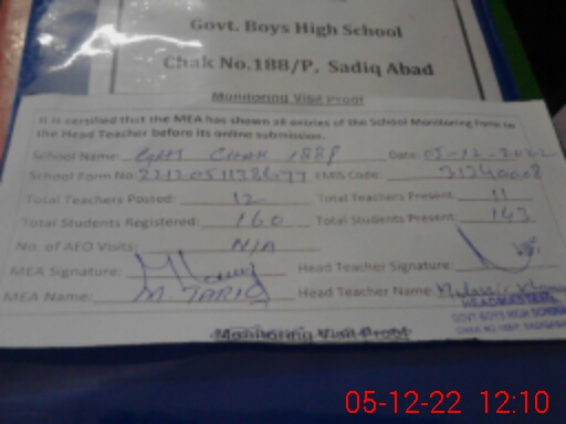 | EMIS Code: 31340008 | Name of School: GHS CHAK NO. 188/P | |||