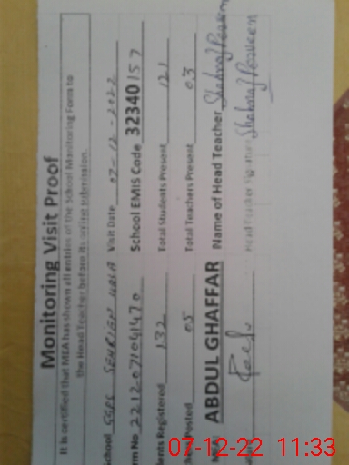 | School Visited by School Health & Nutrition Supervisor (No. of Visits) | 1 | Name1: | Gul Naz Kanwal | Name2: | |