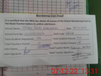 | Attendance Register | Head Teacher | MEA with School | Visit Proof |