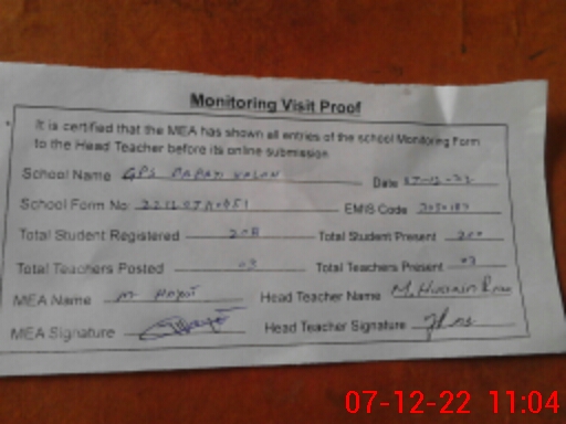 | Attendance Register | Head Teacher | MEA with School | Visit Proof |