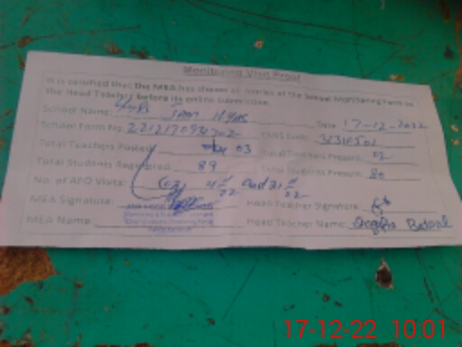 | Attendance Register | Head Teacher | MEA with School | Visit Proof |