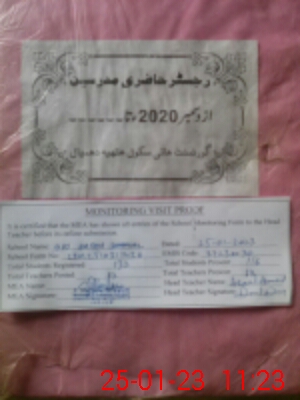 | Total no. of Classrooms: 11 No. of Classrooms Used for Teaching: 8 No. of Classrooms Storing Old Furniture, FTBs, etc: 0Comments if Any: 03 in no new constructed class room required white wash Health and nutrition supervisor did not visit this school since 3 months |