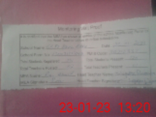 | School Visited by School Health & Nutrition Supervisor (No. of Visits) | 1 | Name1: | SAMINA KOUSER | Name2: | NIL |