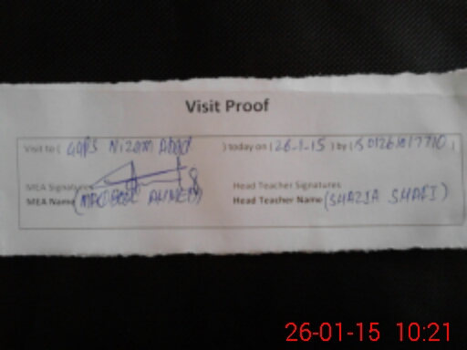 | Remarks (Use Separate Page if Required): Teacher shazia shafi applied to take M ed exams but approved application not available in school class iv present in school AEO visit nil | |||||