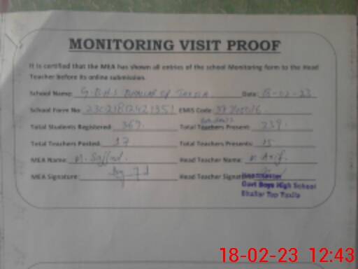 | Certified that this School was Inspected by the Undersigned MEA/DMO Today and the Information Stated Above is as Per Record. | |||||