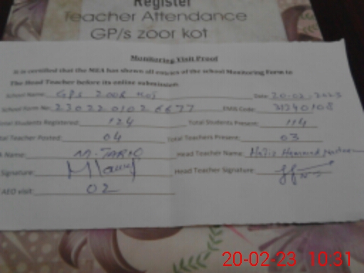 | EMIS Code: 31340108 | Name of School: GPS ZOOR KOT | |||