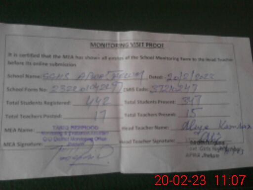 | EMIS Code: 37210247 | Name of School: GGHS APWA JHELUM | |||