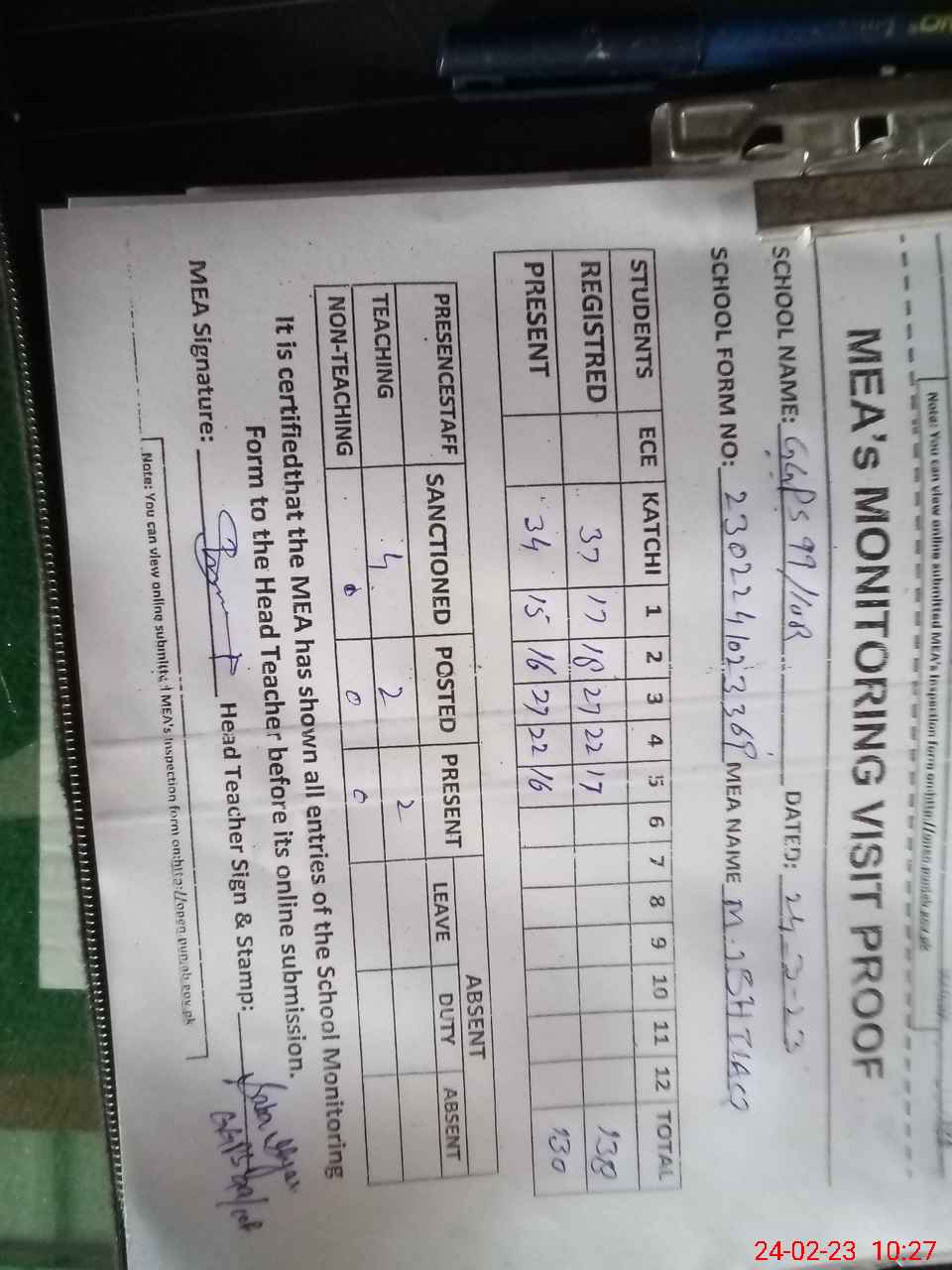 | Attendance Register | Head Teacher | MEA with School | Visit Proof |