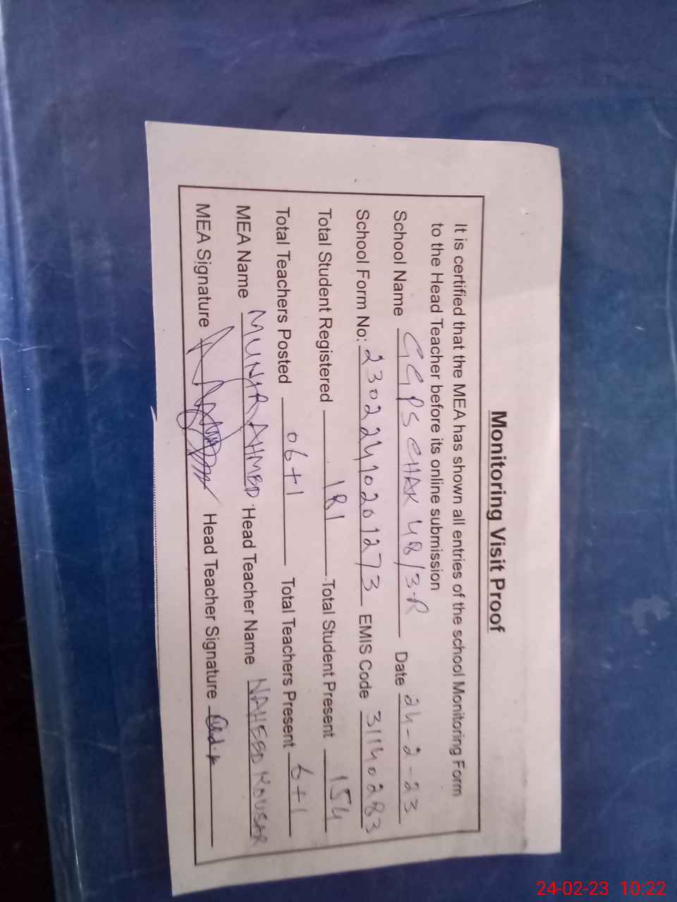 | Attendance Register | Head Teacher | MEA with School | Visit Proof |