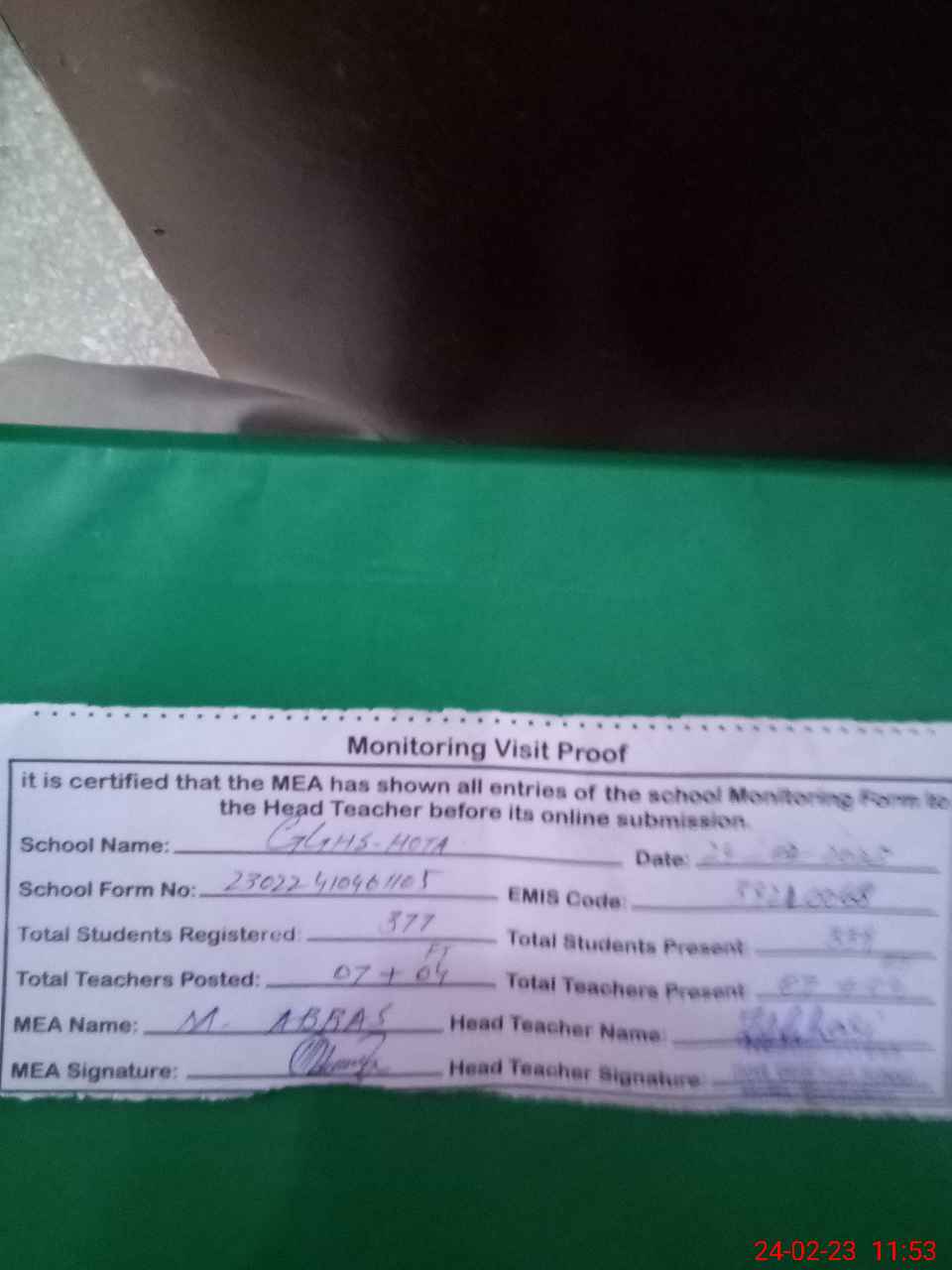 | Attendance Register | Head Teacher | MEA with School | Visit Proof |