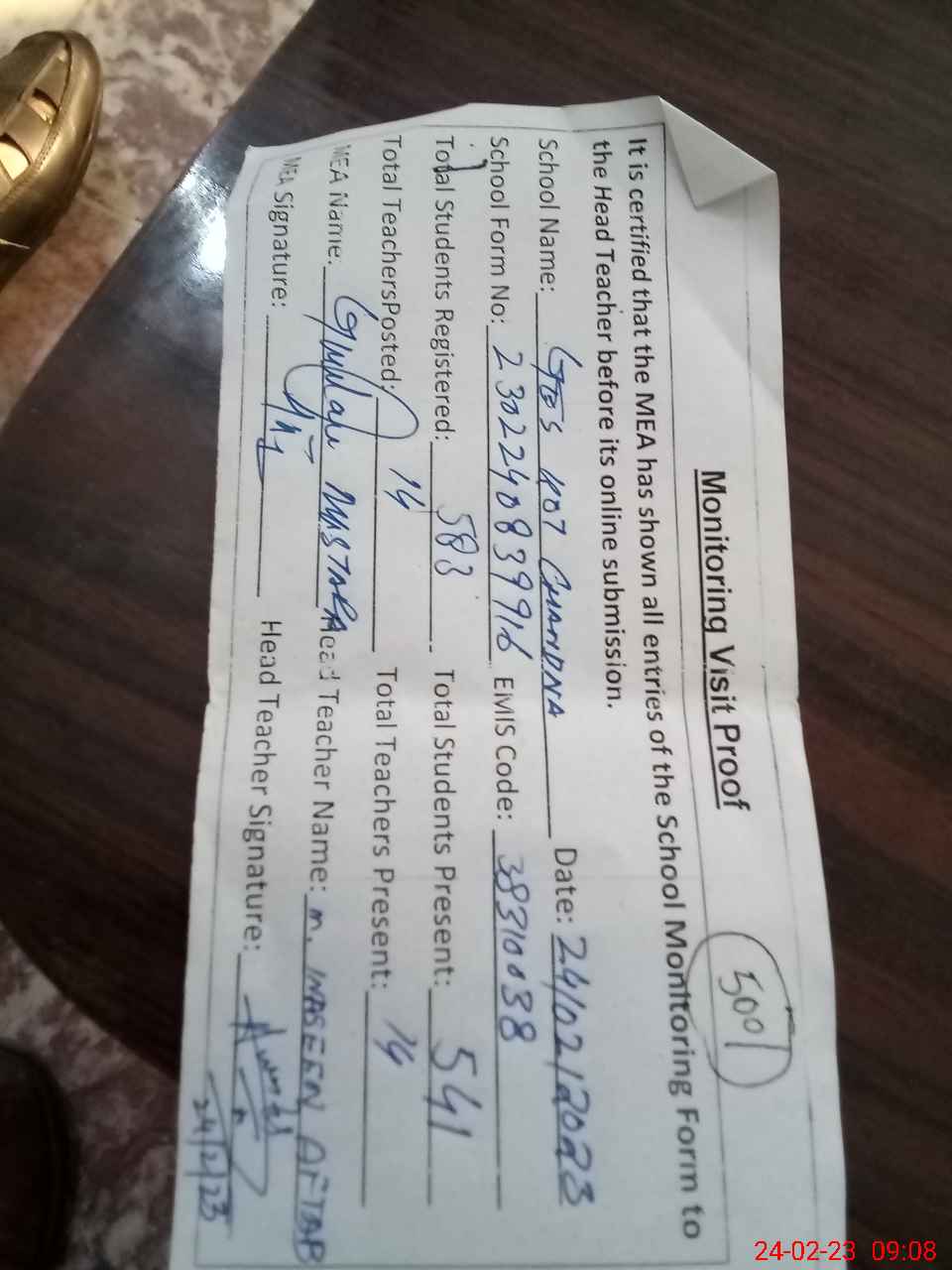 | Attendance Register | Head Teacher | MEA with School | Visit Proof |