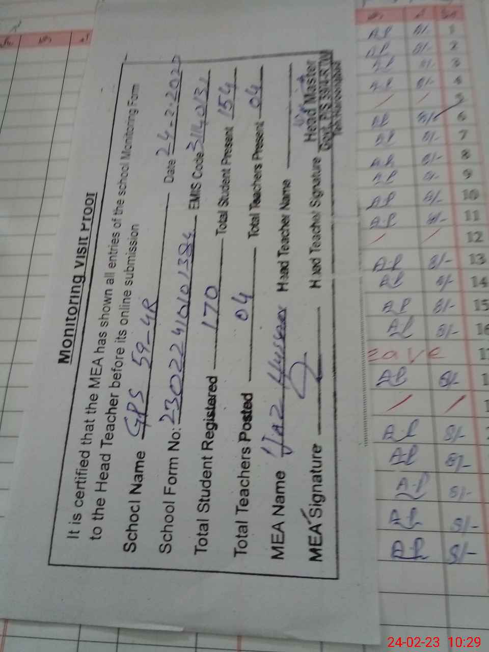 | Attendance Register | Head Teacher | MEA with School | Visit Proof |