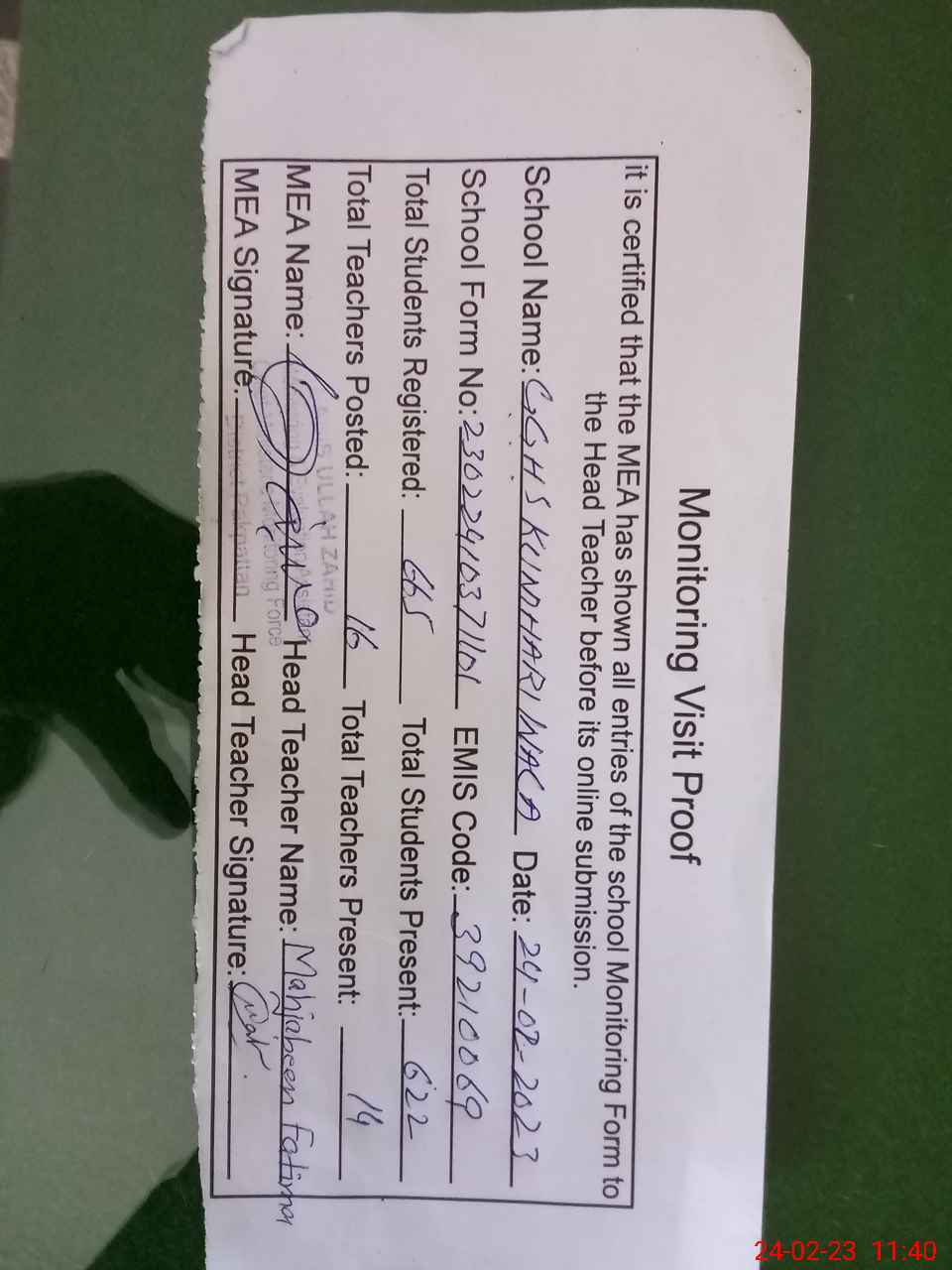 | Certified that this School was Inspected by the Undersigned MEA/DMO Today and the Information Stated Above is as Per Record. | |||||