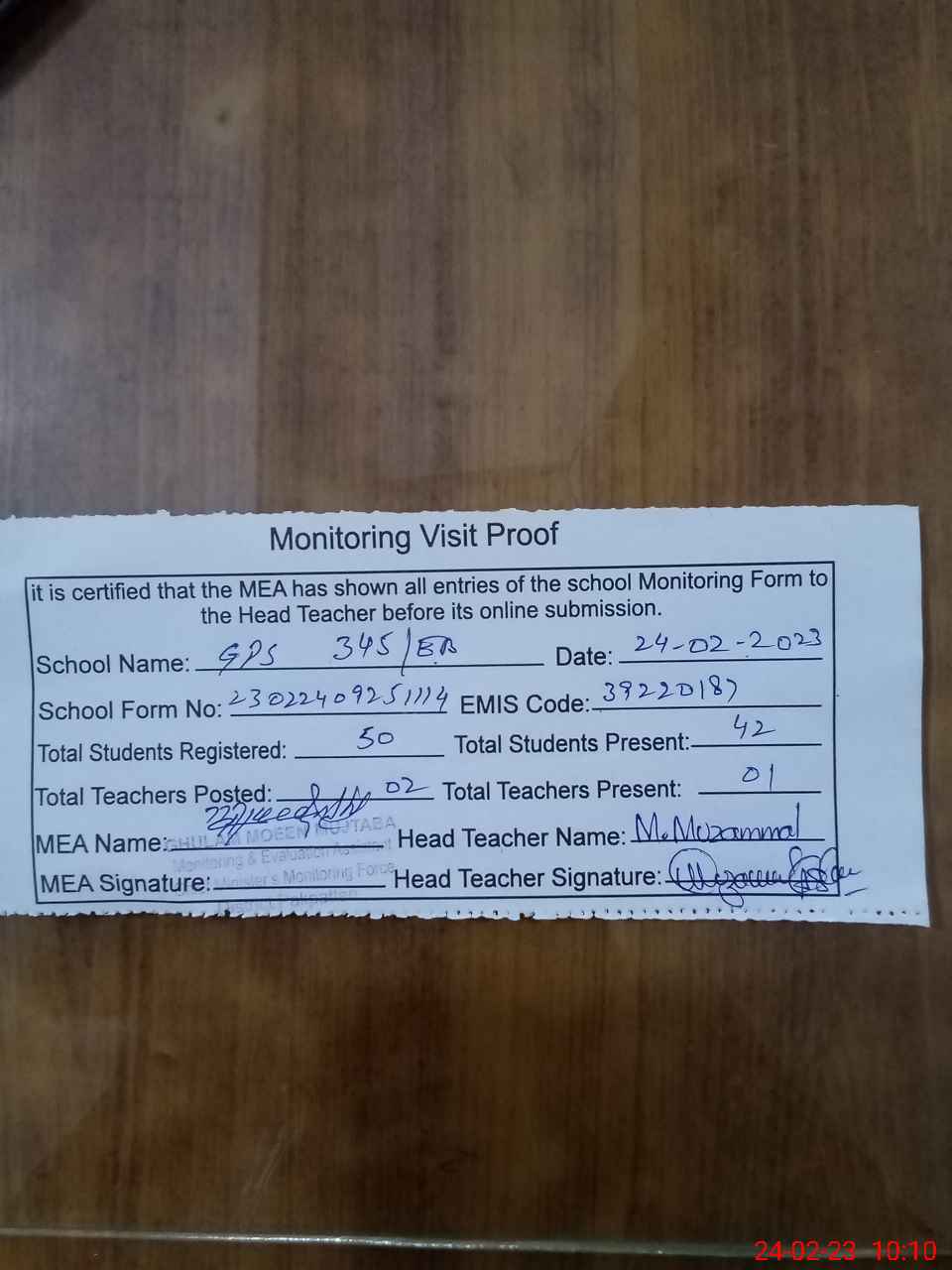| Monitoring Date: 24-02-2023 | Start Time: 24-02-2023 09:25 AM | End Time: 24-02-2023 10:10 AM | Name of MEA: Gh**** Mu**** Mu**** (R**** | |