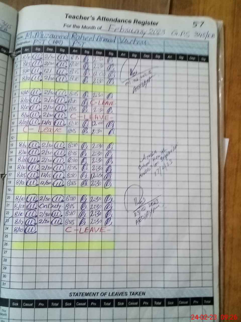 | Name: RA**** AH**** Designation: (School Headmaster's/Headmistress's) PST Phone/Cell Number: 03**** |