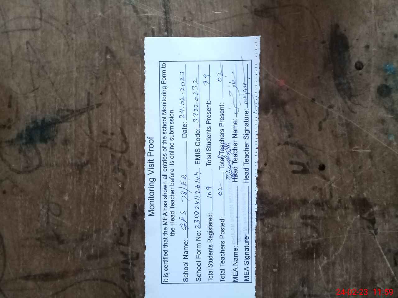 | Attendance Register | Head Teacher | MEA with School | Visit Proof |