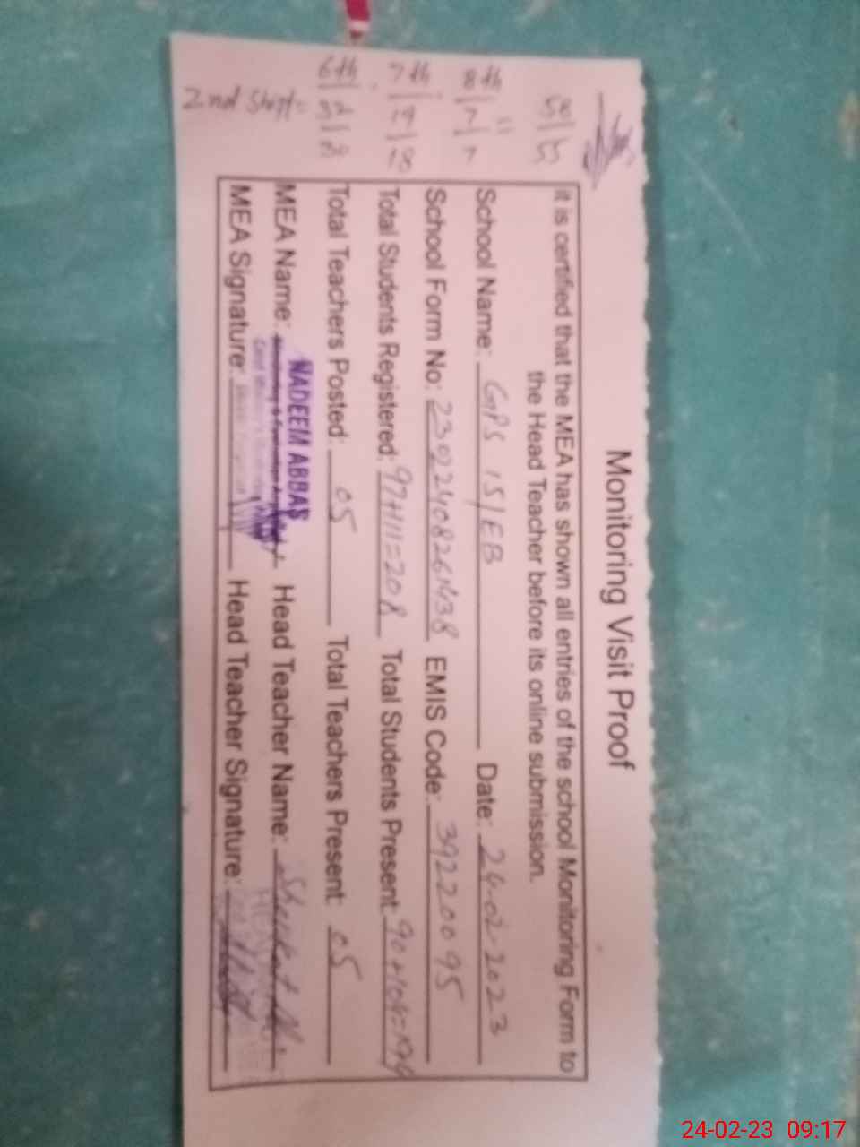 | Attendance Register | Head Teacher | MEA with School | Visit Proof |