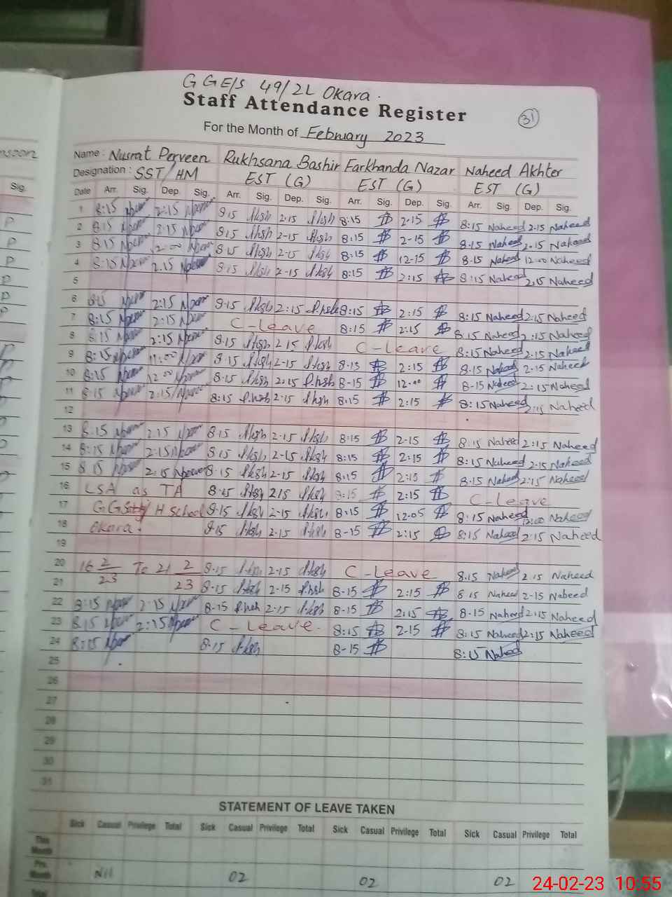| No. of Students Present - Female | 0 | 0 | 61 | 58 | 50 | 42 | 40 | 70 | 65 | 45 | 32 | 463 | ||||