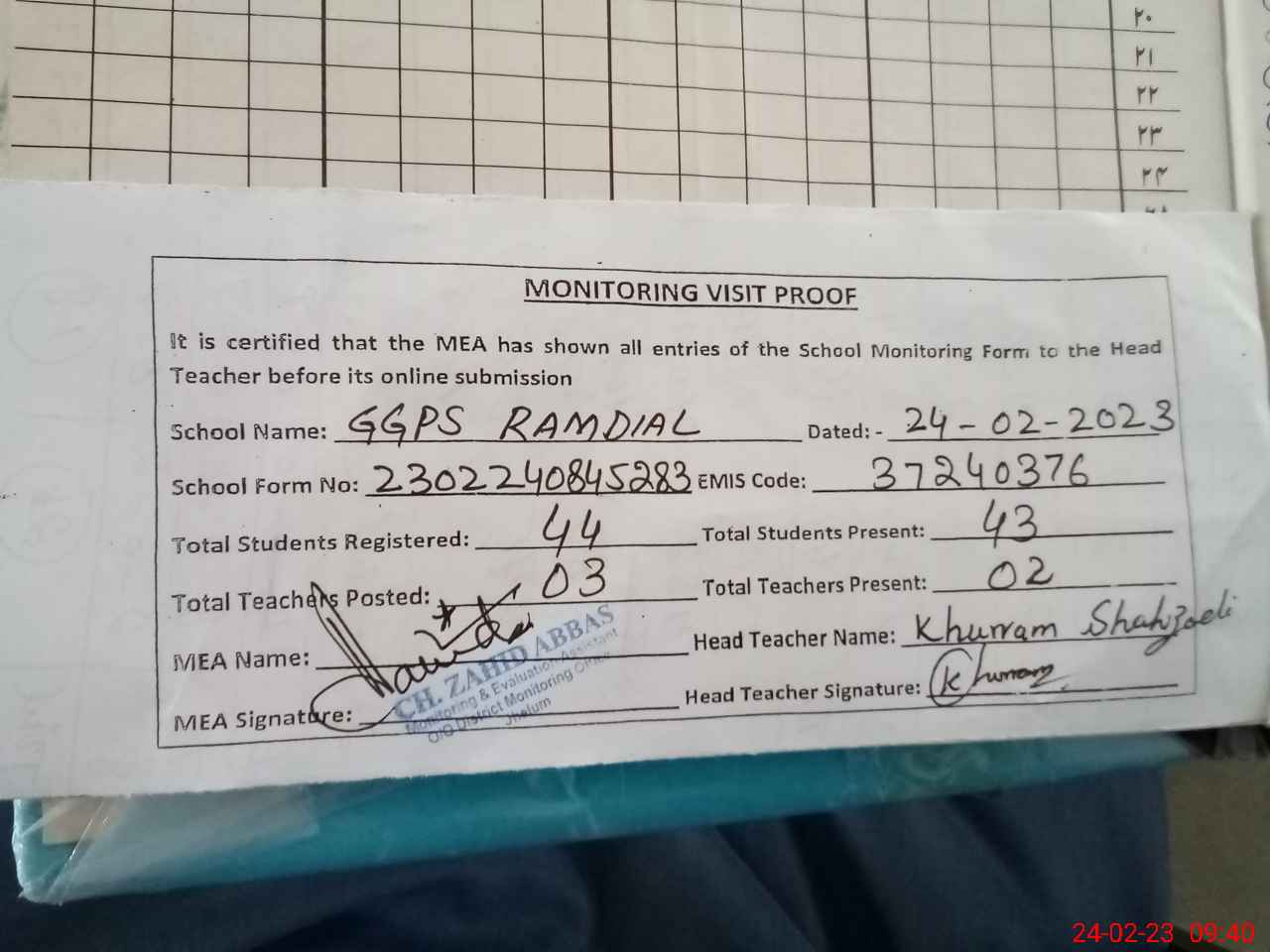 | Attendance Register | Head Teacher | MEA with School | Visit Proof |