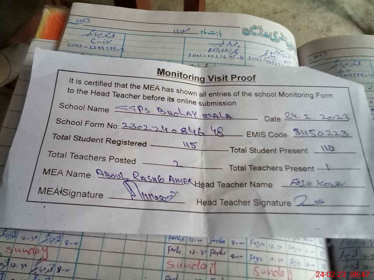 | Attendance Register | Head Teacher | MEA with School | Visit Proof |