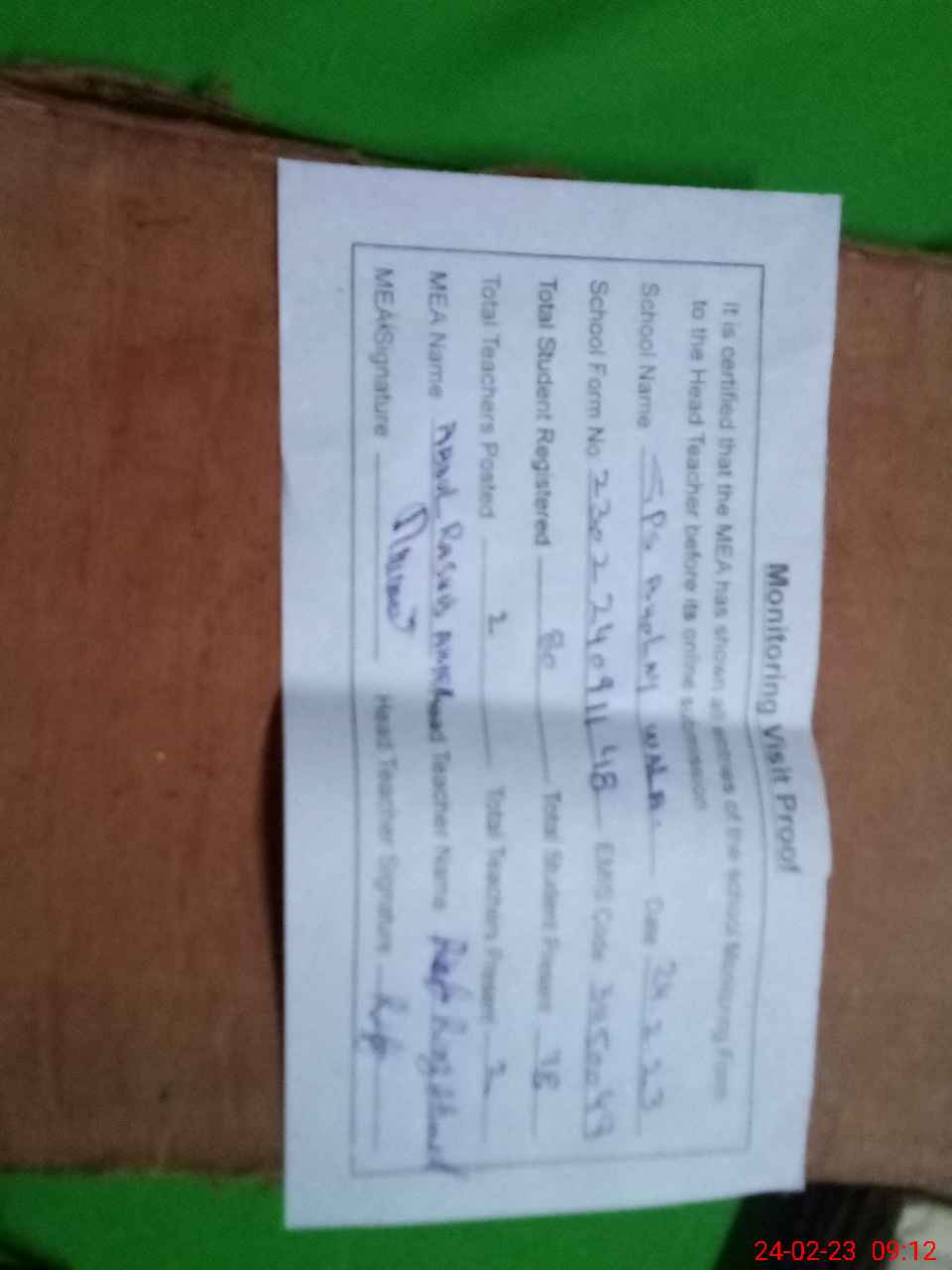 | Attendance Register | Head Teacher | MEA with School | Visit Proof |