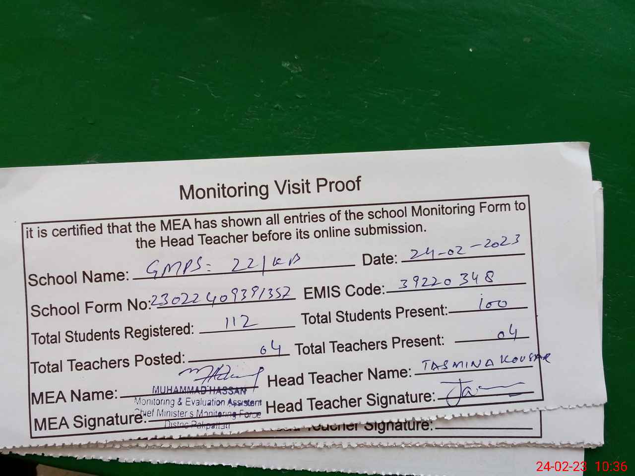 | Attendance Register | Head Teacher | MEA with School | Visit Proof |