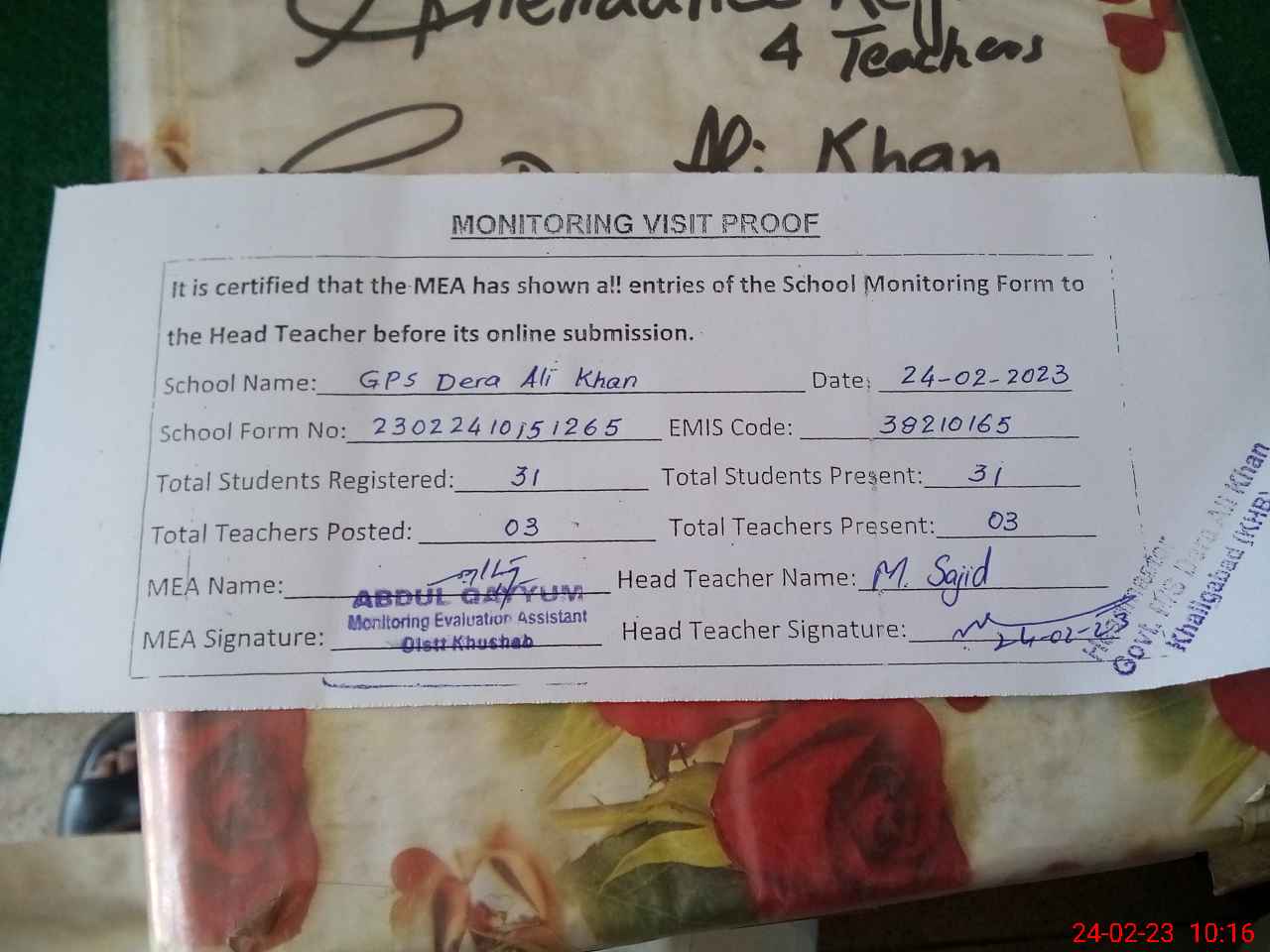 | Attendance Register | Head Teacher | MEA with School | Visit Proof |
