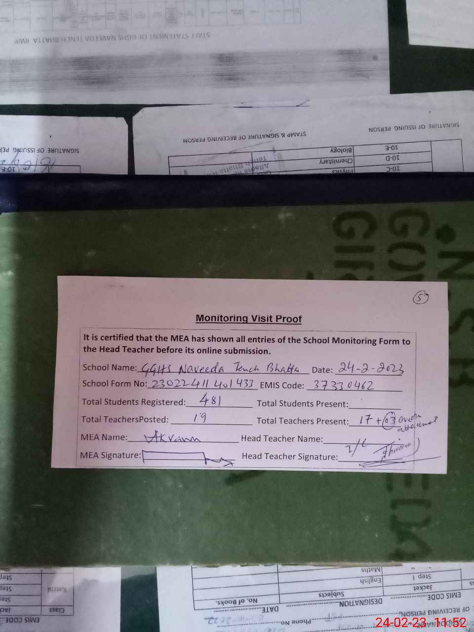 | Attendance Register | Head Teacher | MEA with School | Visit Proof |