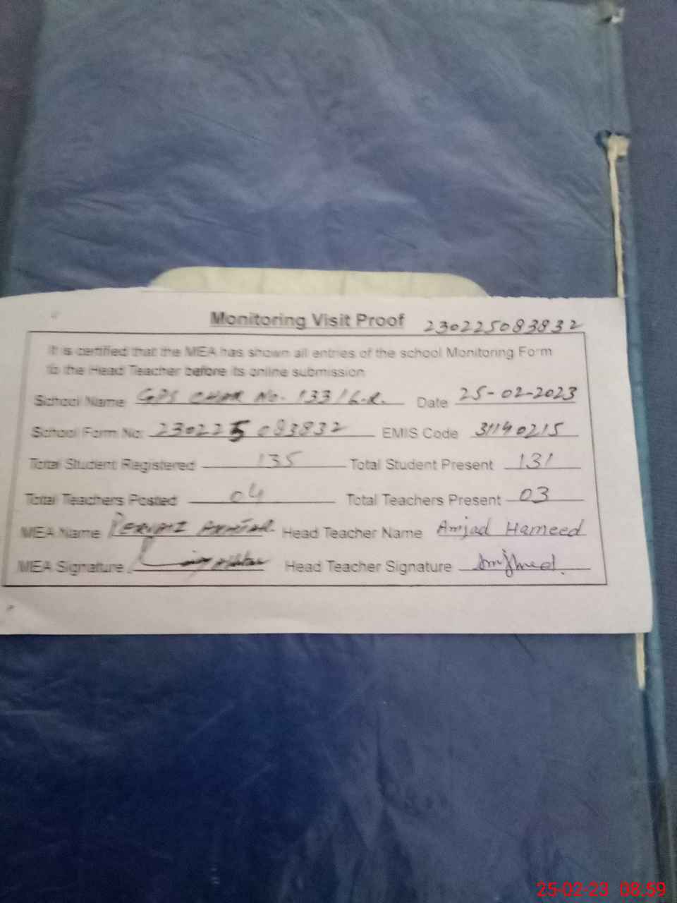 | Attendance Register | Head Teacher | MEA with School | Visit Proof |