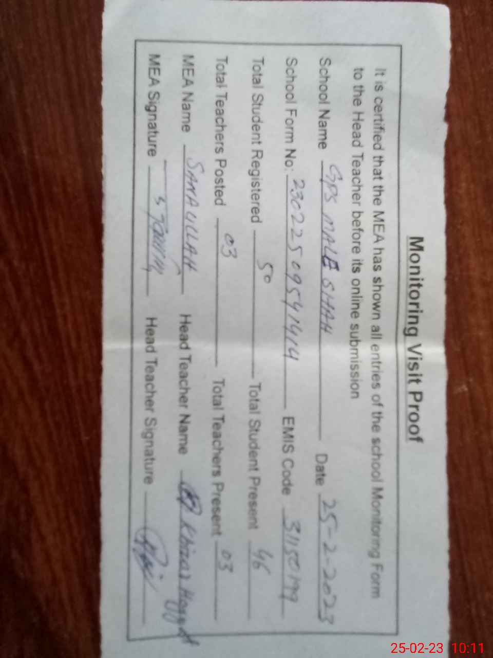 | Attendance Register | Head Teacher | MEA with School | Visit Proof |