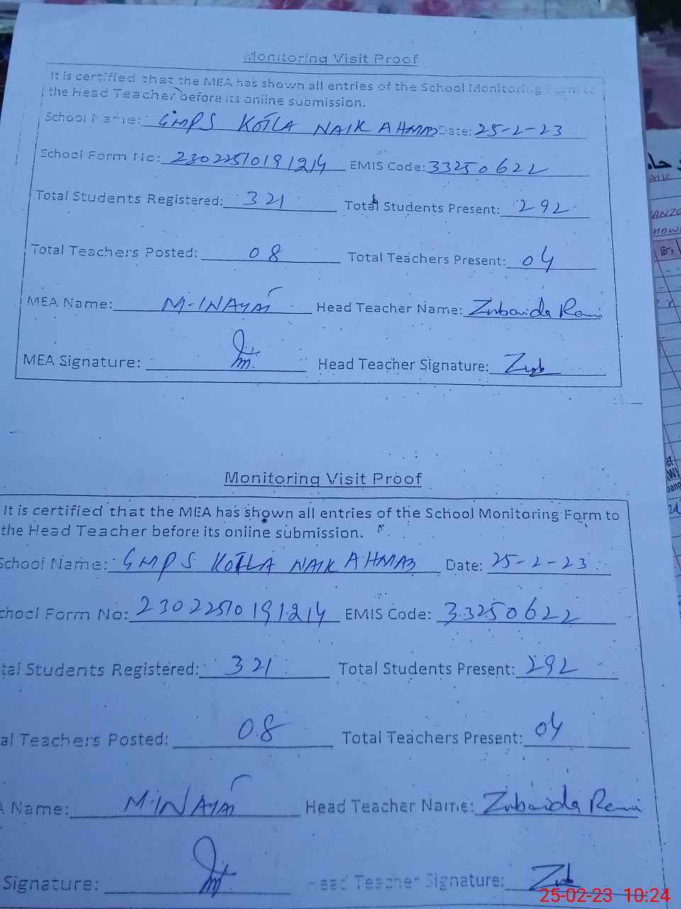 | Attendance Register | Head Teacher | MEA with School | Visit Proof |