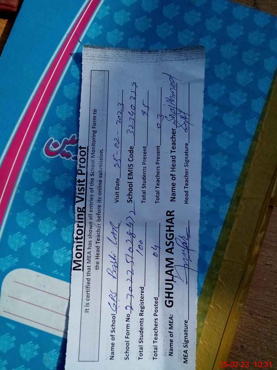 | Attendance Register | Head Teacher | MEA with School | Visit Proof |