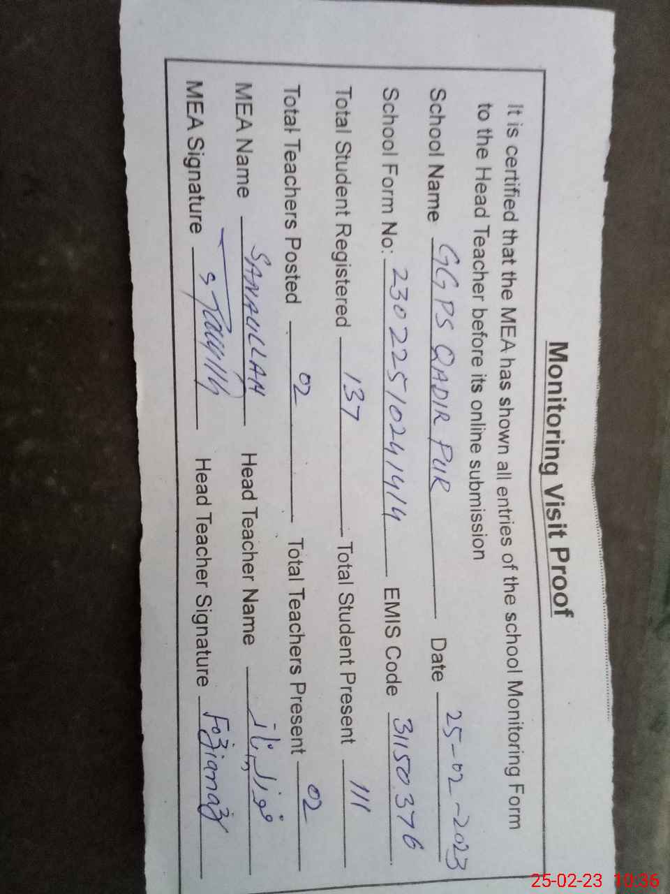 | EMIS Code: 31150376 | Name of School: GGPS QADIR PUR | |||