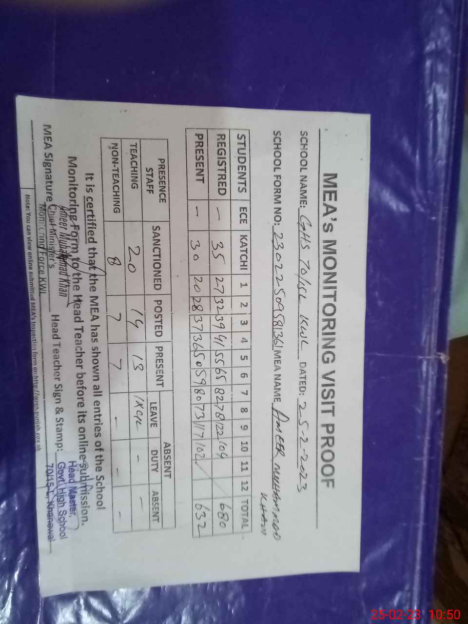 | Attendance Register | Head Teacher | MEA with School | Visit Proof |