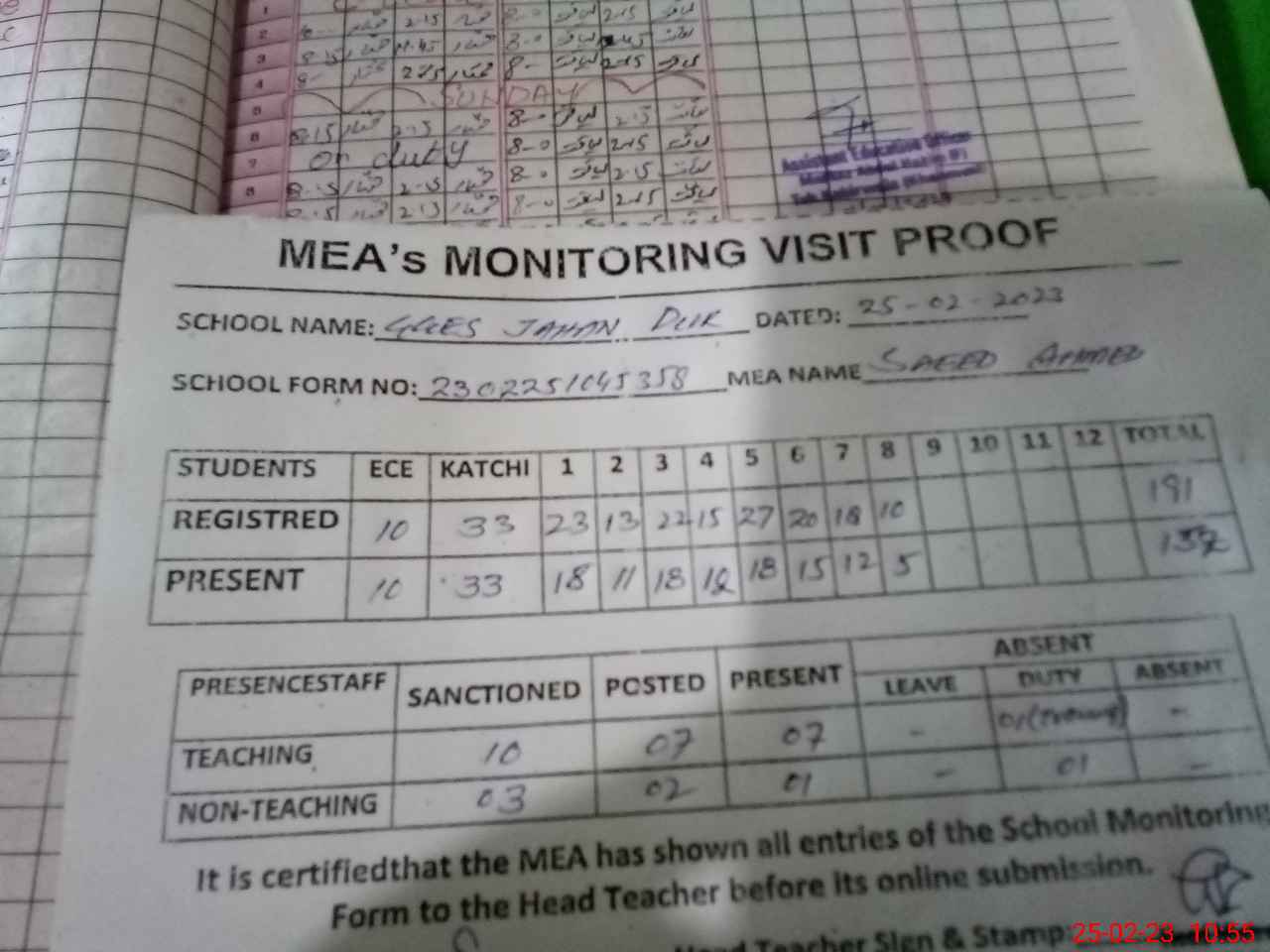 | Attendance Register | Head Teacher | MEA with School | Visit Proof |