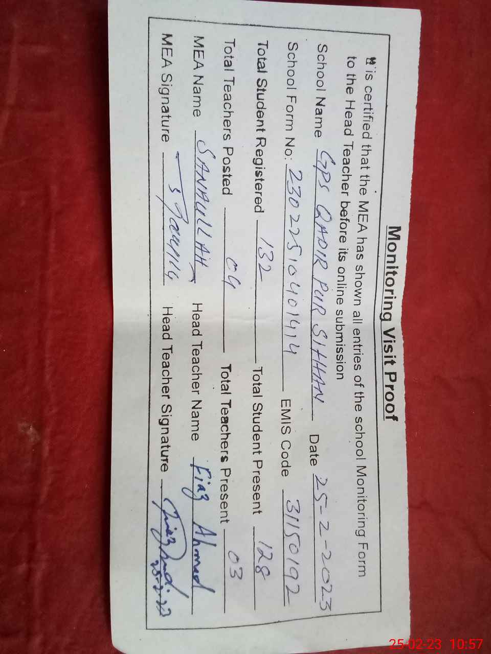 | Attendance Register | Head Teacher | MEA with School | Visit Proof |