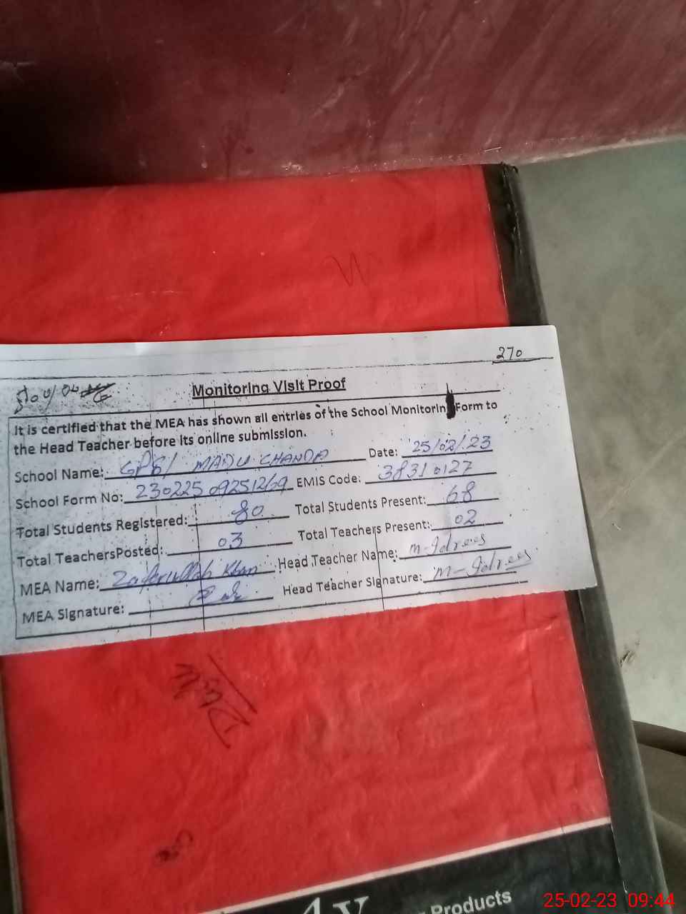 | Attendance Register | Head Teacher | MEA with School | Visit Proof |