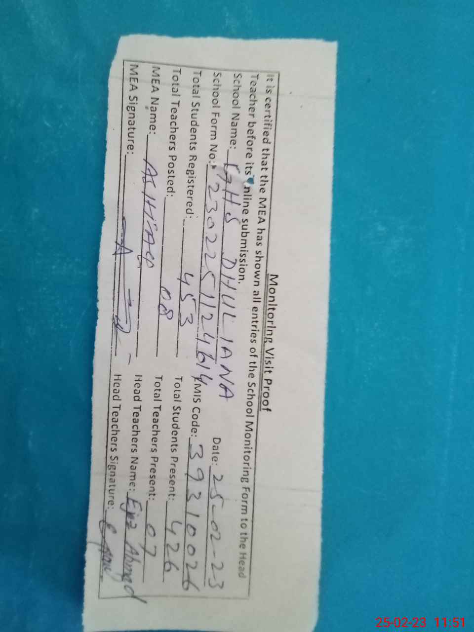 | Attendance Register | Head Teacher | MEA with School | Visit Proof |