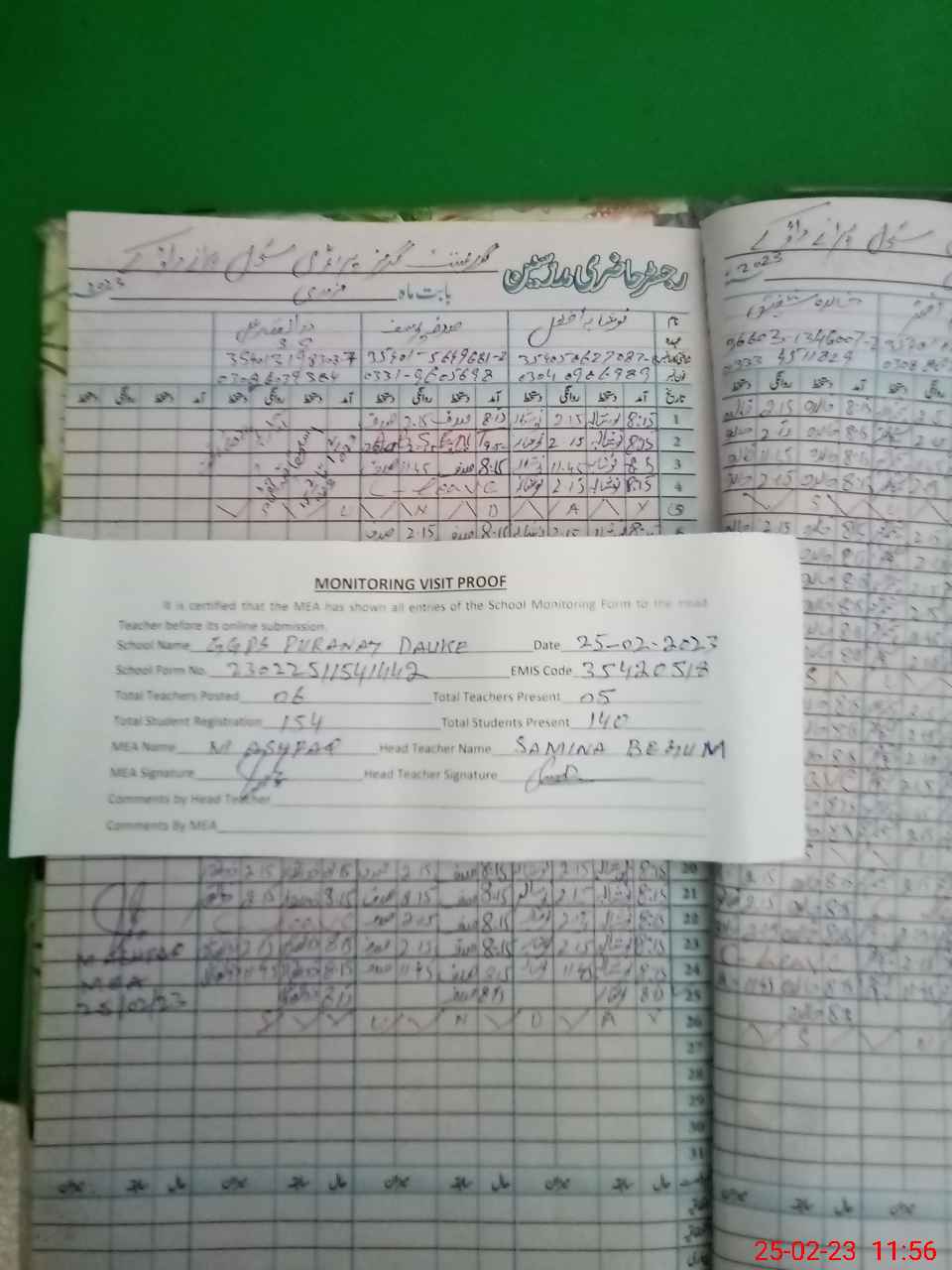 | Attendance Register | Head Teacher | MEA with School | Visit Proof |