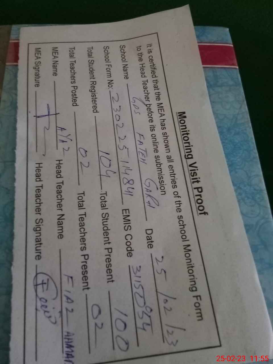 | Attendance Register | Head Teacher | MEA with School | Visit Proof |
