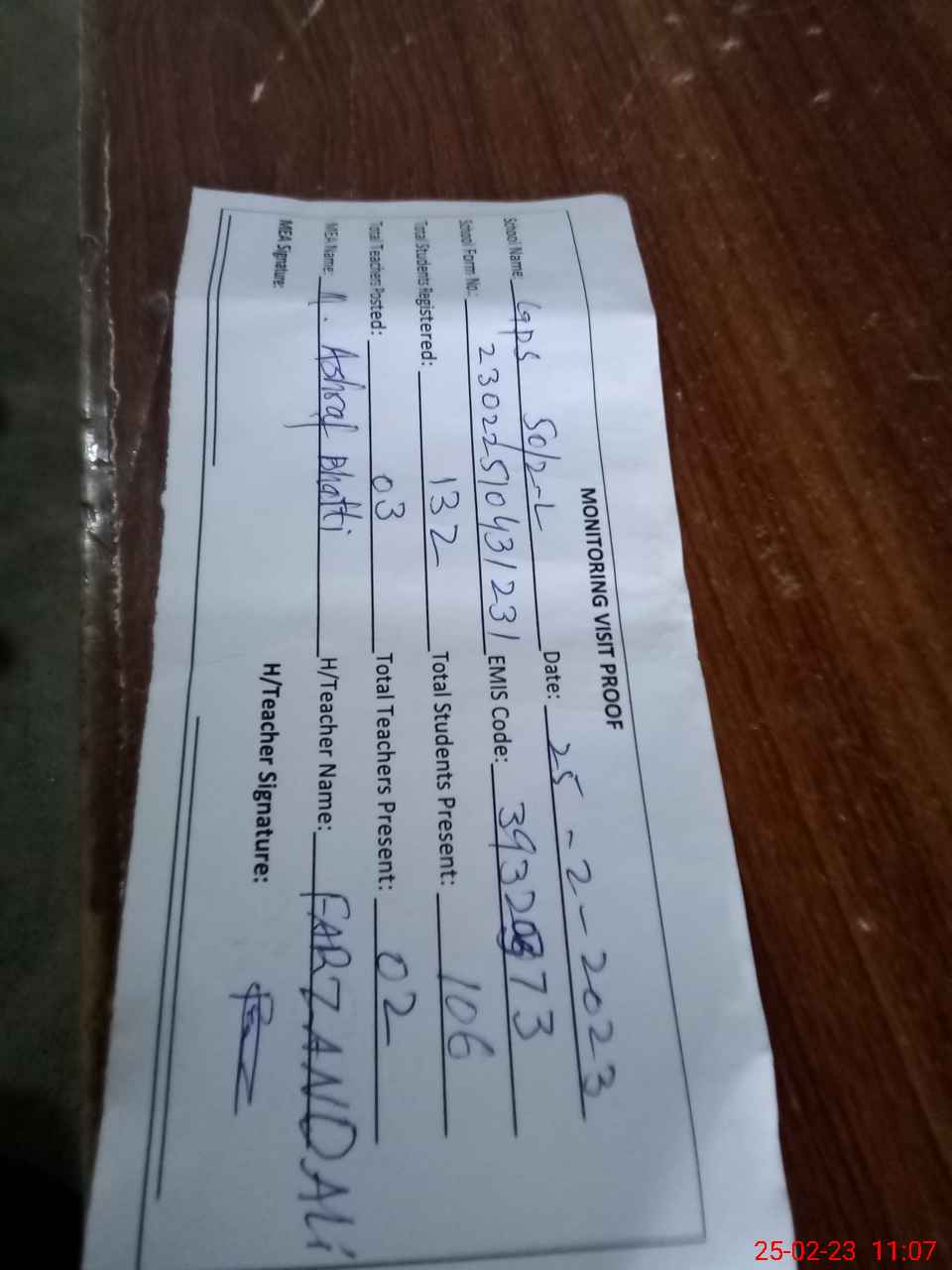 | Attendance Register | Head Teacher | MEA with School | Visit Proof |