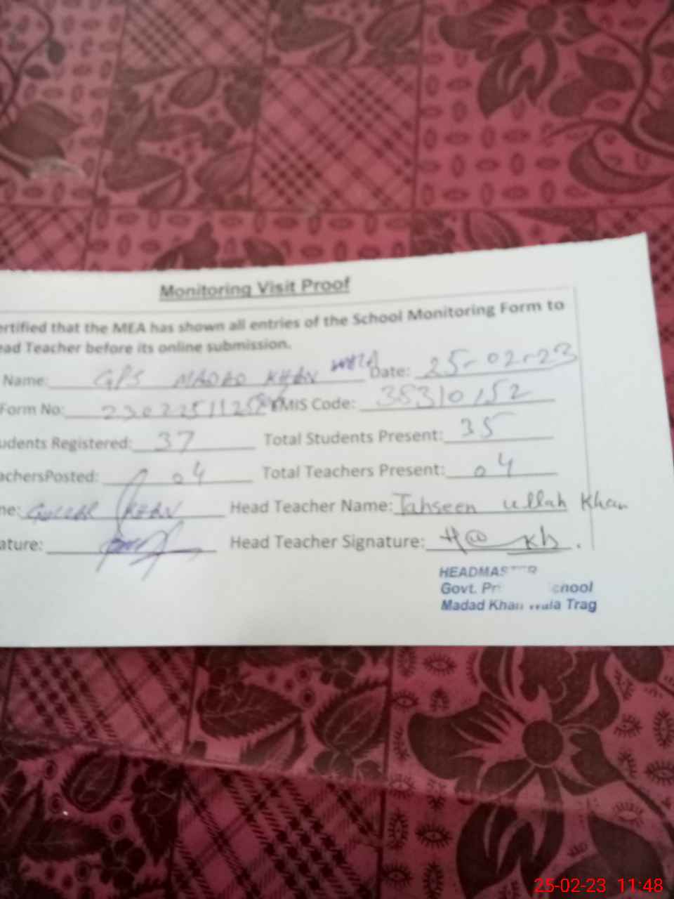 | Attendance Register | Head Teacher | MEA with School | Visit Proof |