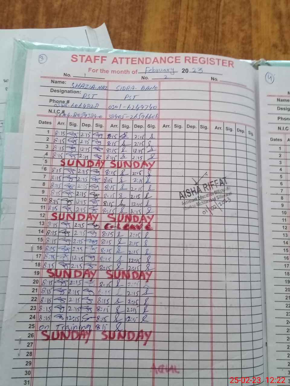 | CNIC | Full Name | Designation | R/C | Absence During Last Calender Month |