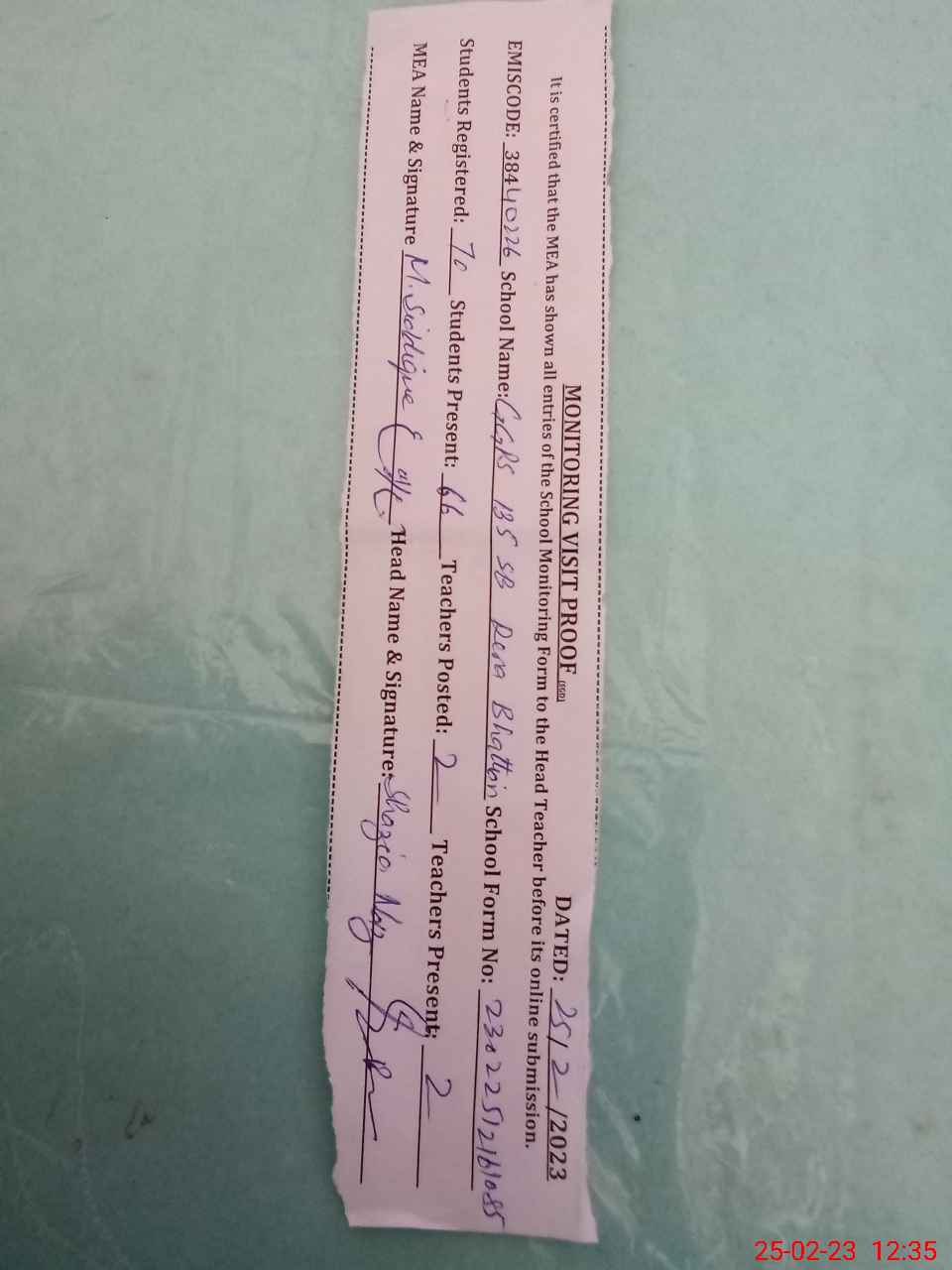 | Attendance Register | Head Teacher | MEA with School | Visit Proof |