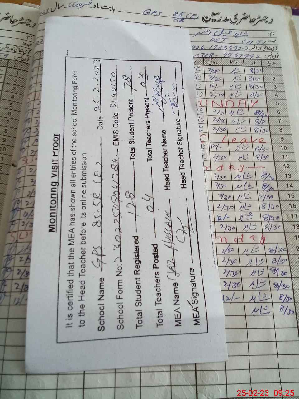 | Attendance Register | Head Teacher | MEA with School | Visit Proof |